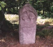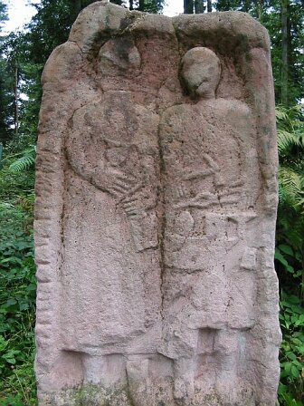 A l'entrée du camp celtique, près de la poterne Est (6), un plan répertorie les lieux principaux. A droite, une stèle-maison et son inscription en latin. Ci-dessous, le forgeron et sa femme (reproduction d'après fragments). |
