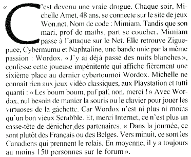 L'article ci-contre est paru dans le Nouvel Economiste sous la signature de Doan Bui. Découverte grâce à ma page perso, j'ai été contactée pour illustrer cet article qui vante les jeux de réflexion sur Internet, plus porteurs semble-t-il que d'autres en termes d'efficacité marchande. Le dessinateur attitré du périodique a imaginé à sa manière nos soirées ! |