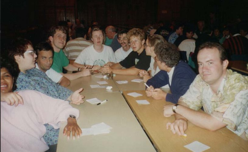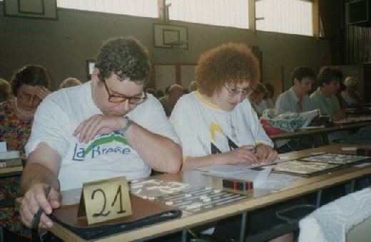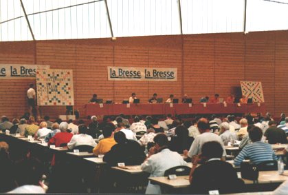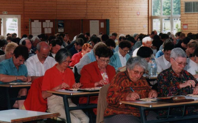 Les parties de Scrabble se sont disputées au gymnase municipal jusqu'en 1993. A la table 1, Pascal Fritsch est confiant, son avance est suffisante. Table 2, Bernard Caro cherche jusqu'au bout pour prévenir la menace des Lorrains Régis Marczak et Francis Leroy qui le talonnent. Plus loin, Jean-Pierre Kahn et Jean Biblocque semblent expédier les affaires courantes.
